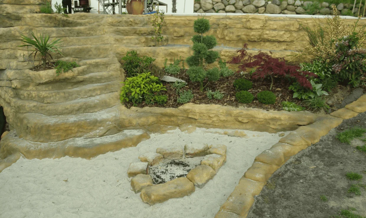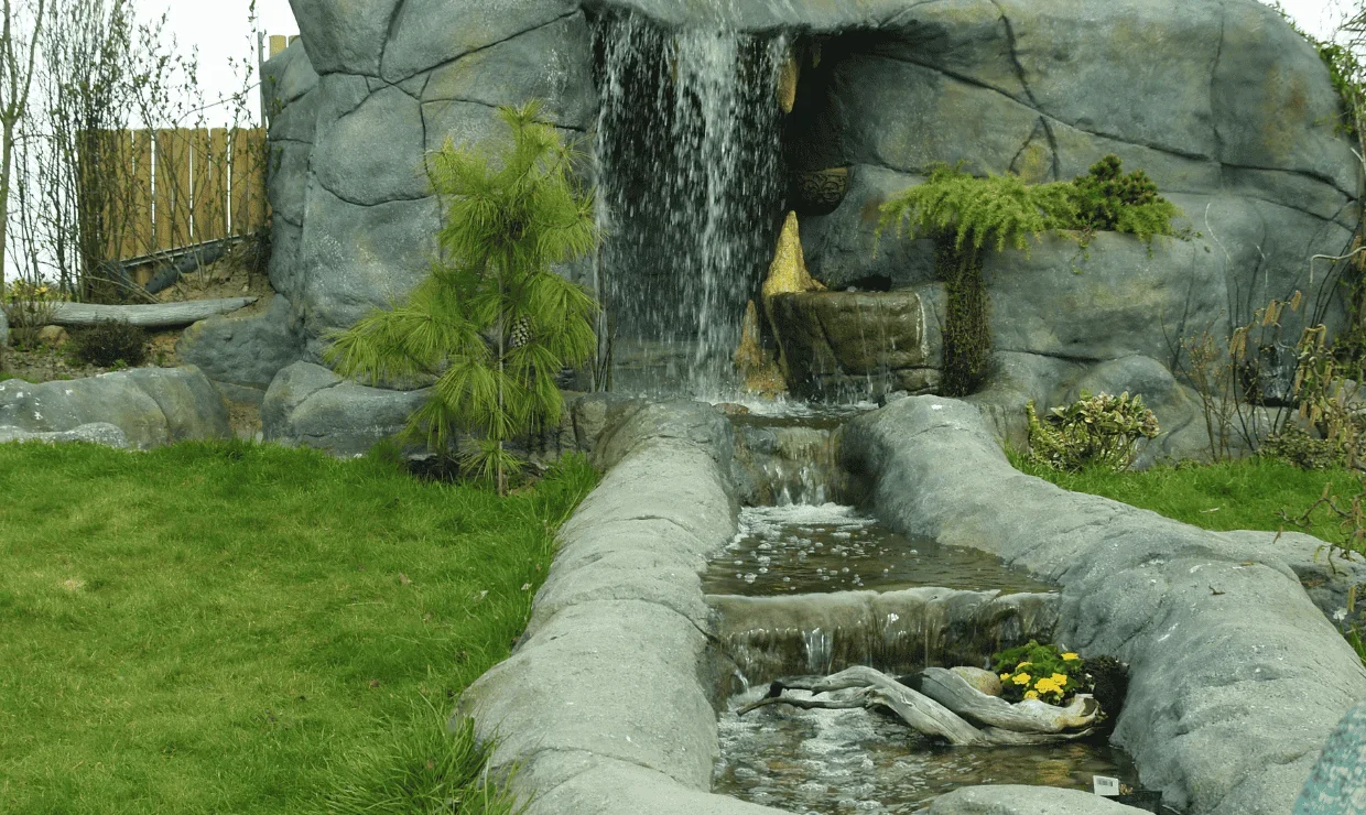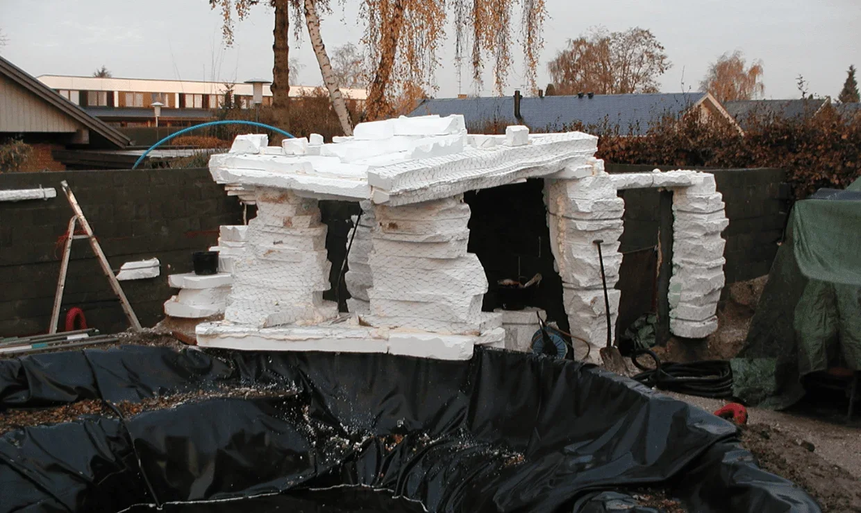 Hager med kunstige klipper, trapper, fossefall og hagedam bygget opp i MakeMake-materialer.