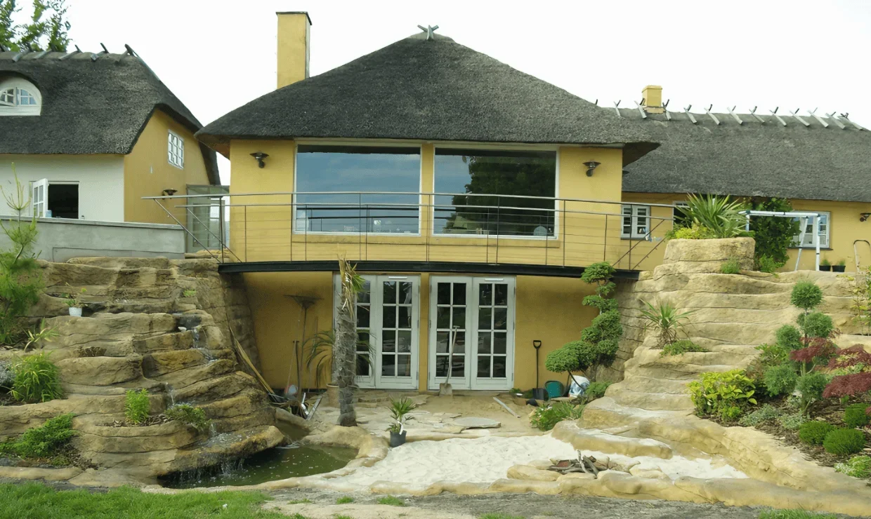 Her er eksempler på private hjem hvor eier har ønsket en unik løsning med kunstige klipper langs den store hagedammen, samt klippegrotte, eller naturlige trapper og bekker med kunstige klipper.