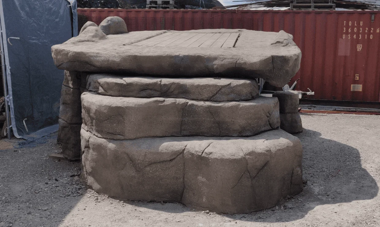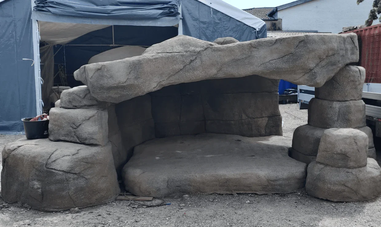 Klippehulen er bygget opp av fem klippestykker, som hver er konstruert over et stålskjelett dekket med nett. Deretter er dekorasjonsbetong sprøytet på, og overflaten er bearbeidet ved rissing for å ligne ekte klipper. Til slutt er klippehulen malt med Colour Fix og fargepigmenter.