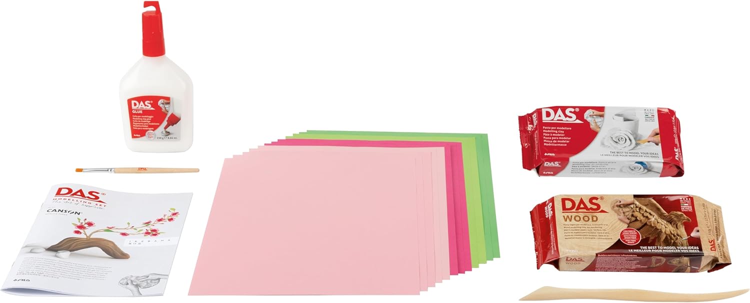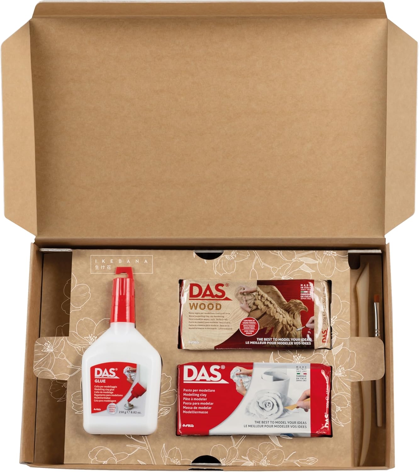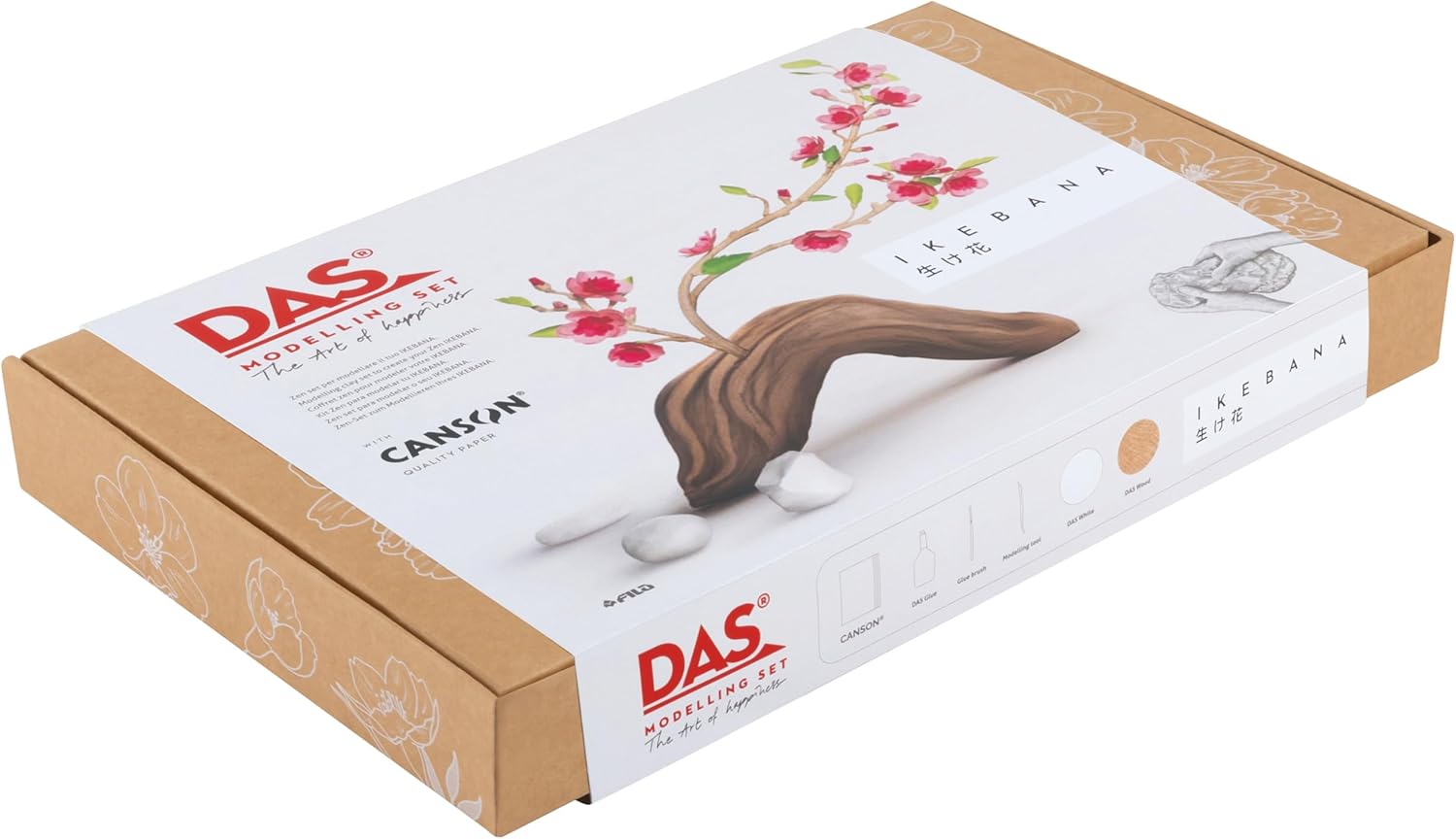 Med DAS selvherdende leire av høy kvalitet kan du forme vakre skåler, vaser eller baser til blomsteroppsatsene dine — dette settet veileder deg til å lage det flotte oppsettet du ser på forsiden av pakken. Sett inneholder alt du trenger for å lage harmoniske og estetiske komposisjoner inspirert av japansk design og mindful håndverk.
